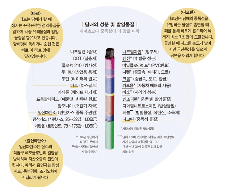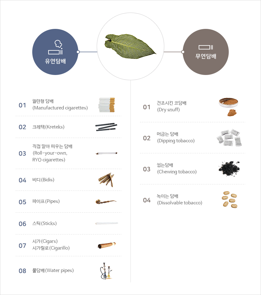 일반적으로 알고 있는 궐련형 담배 이외에도 전자담배, 파이프담배, 씹는 담배, 냄새 맡는 담배, 물담배, 머금는 담배 등이 있으며, 피우는 방법과 모양은 모두 달라도 담배의 신체적 위해는 같습니다.