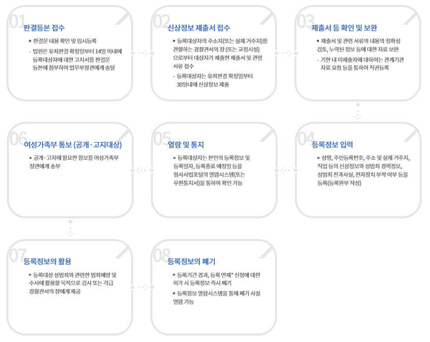 성범죄자가 법원으로부터 신상정보 공개명령 및 고지명령 처분을 받으면 정부기관에 신상정보가 등록되어 성범죄자 알림e 사이트(www.sexoffender.go.kr)에 공개되고, 성범죄자가 거주하고 있는 지역(읍·면·동)의 아동·청소년 보호세대와 어린이집, 유치원, 학교, 학원, 지역아동센터 등에 우편으로 정보가 제공됩니다.