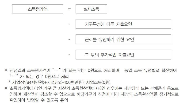 소득평가액 = [실제소득 – 가구특성별 지출비용 – (근로소득공제 + 그 밖에 추가적인 지출)] |
