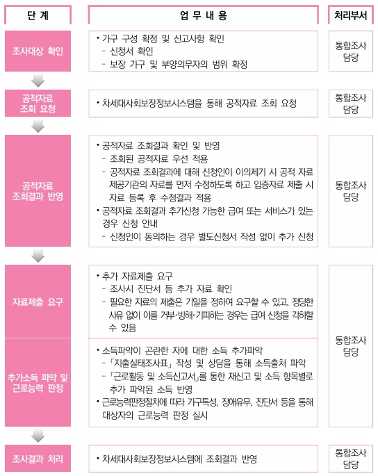 ※ 급여를 실시하는 국가 또는 지방자치단체(이하“보장기관”이라 함)의 수급자격 조사방법