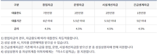 ※ 그 밖에 한국여성경제인협회, 아름다운재단에서는 일정 요건을 갖춘 한부모가족에게 창업자금 대여하고 있습니다. 자세한 내용은 해당기관 홈페이지를 참고하시기 바랍니다.