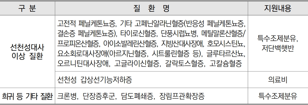 ※ 선천성이상아(先天性異常兒)란 보건복지부장관이 선천성이상의 정도·발생빈도 또는 치료에 드는 비용을 고려하여 정하는 선천성이상에 관한 질환이 있는 영유아로서 다음의 어느 하나에 해당하는 영유아를 말합니다(「모자보건법」 제2조제6호 및 「모자보건법 시행령」 제1조의2제2호).