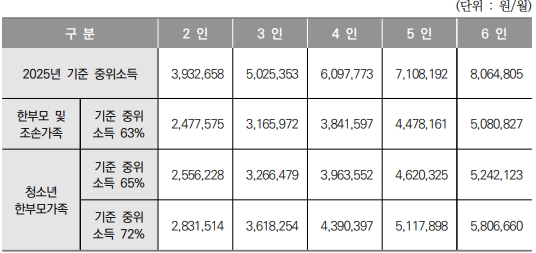 주민등록등본에 개별 가구로 되어 있으나 부(父)는 자(子)에 대한 부양 의무자이므로 부의 소득은 2명 가구를 적용합니다(자녀가 2명인 경우 3명 가구 적용).